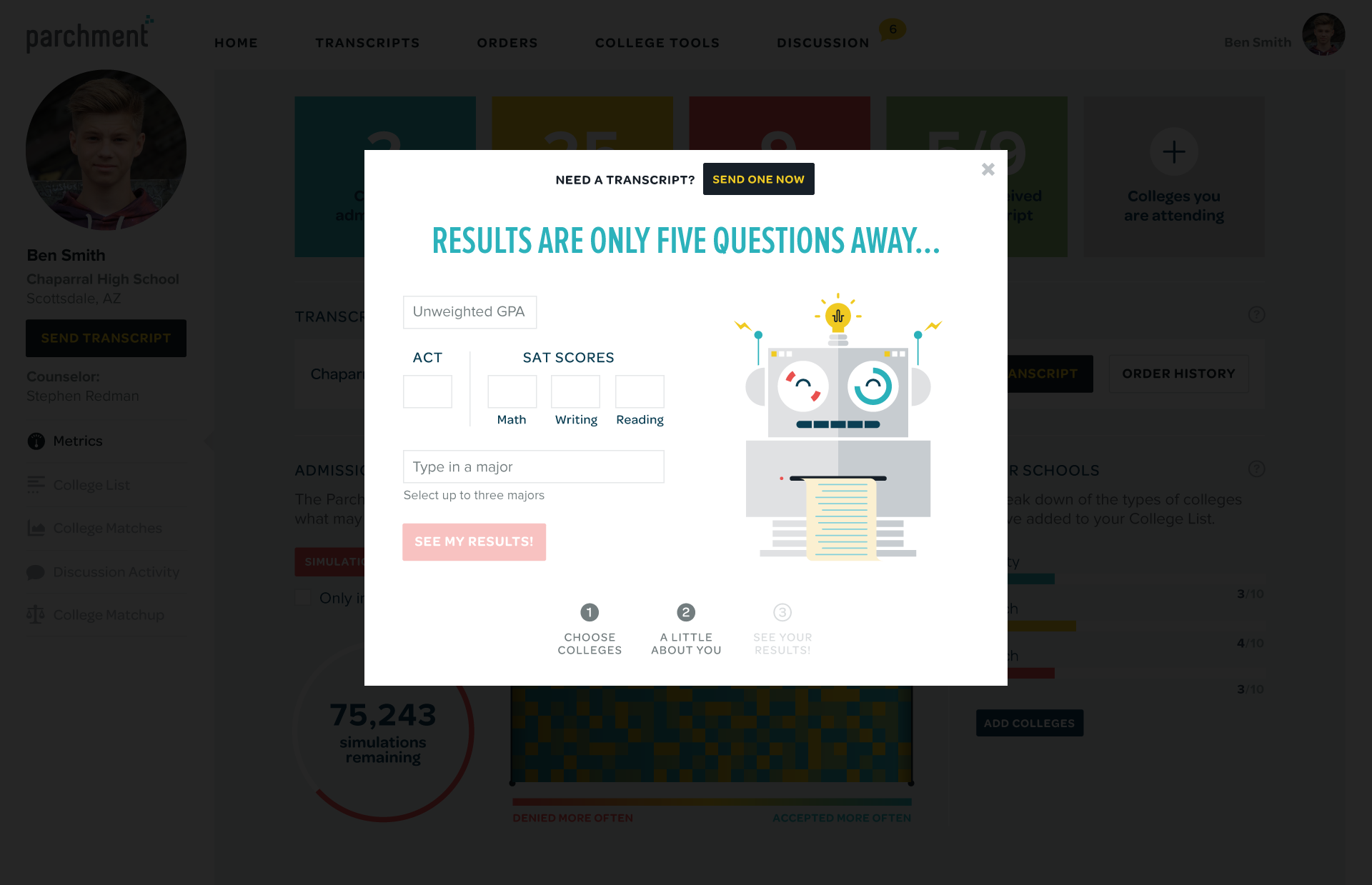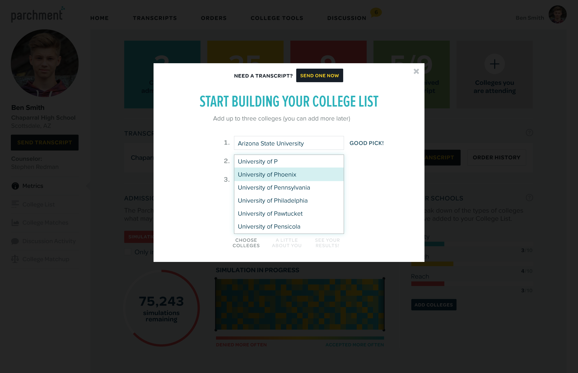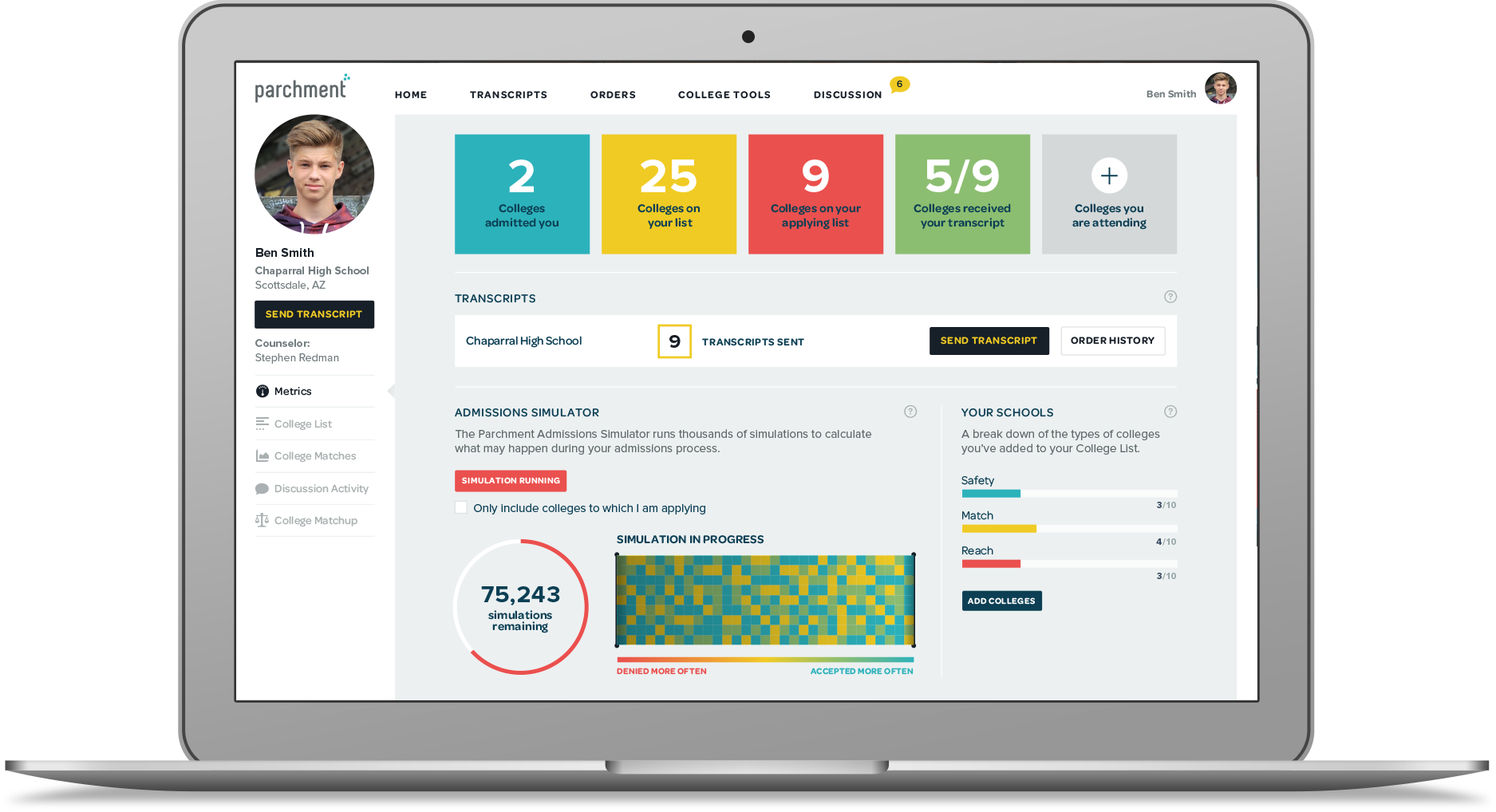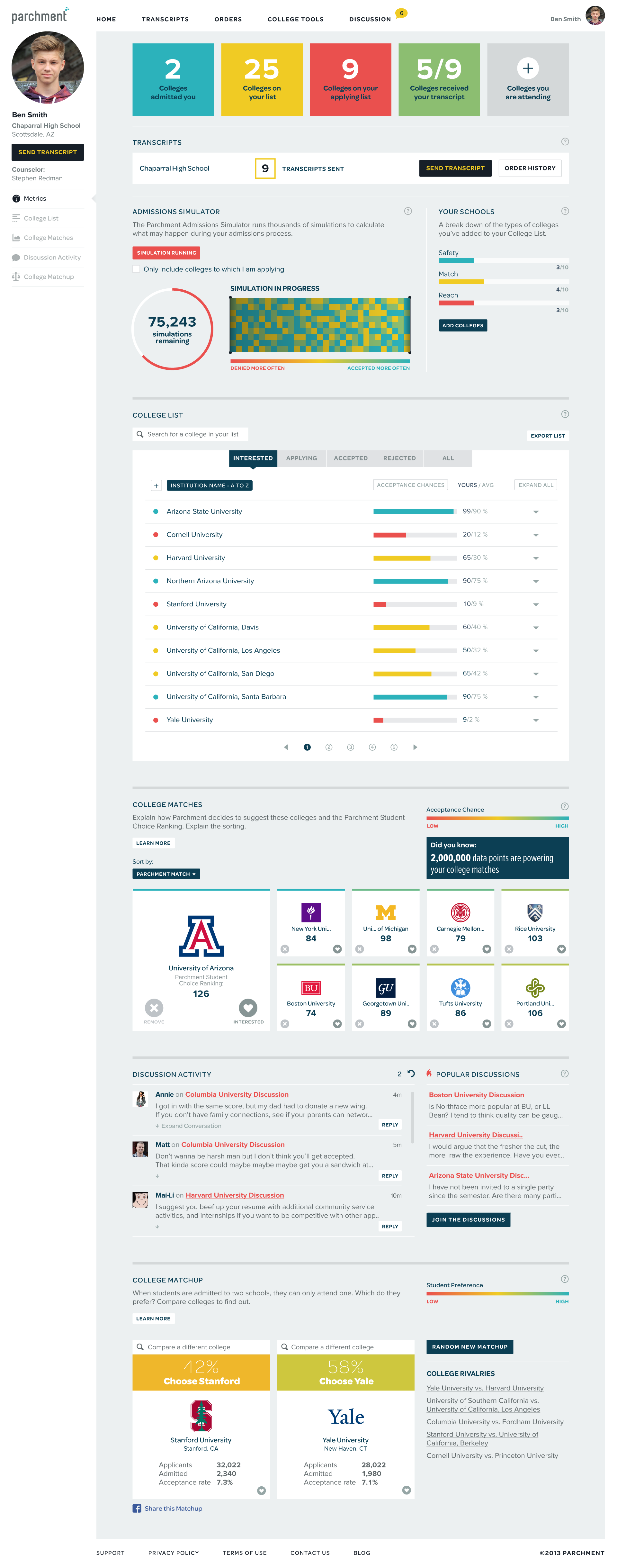 As a value-add to student users, Parchment offers unique data-driven features—such as acceptance chances and college matchups—as well as a comprehensive college preference list and lively discussion board. The redesigned dashboard consolidates these features, and encourages students to keep coming back.